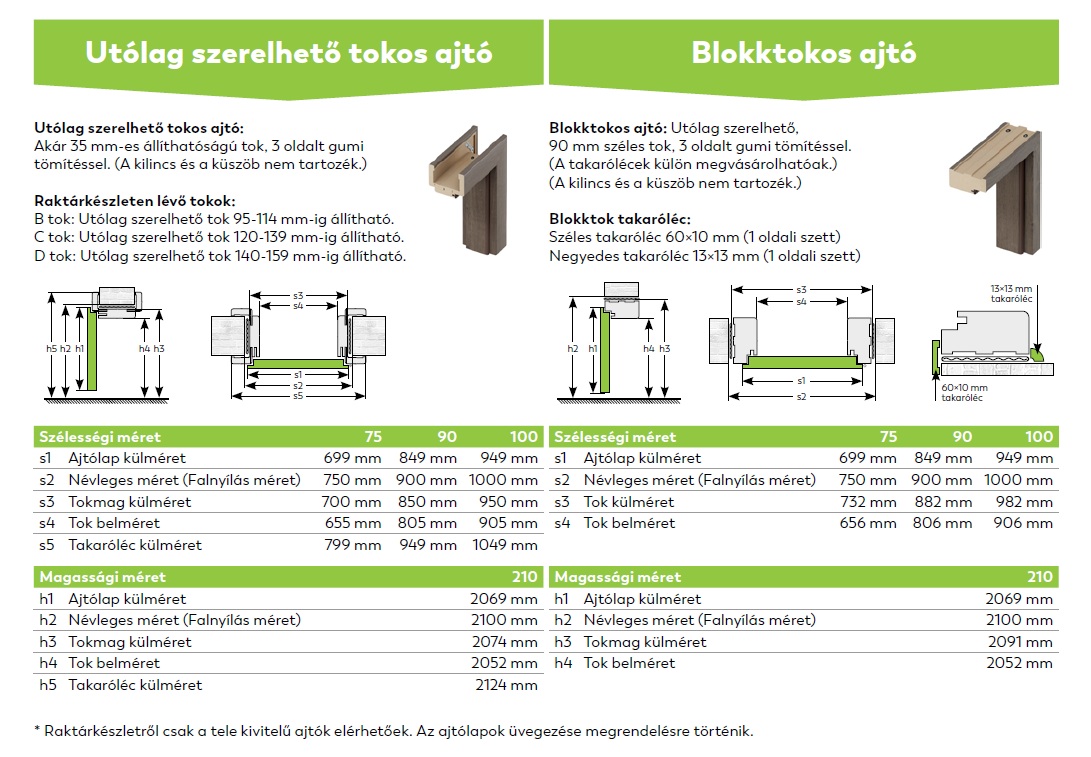 Dekorfóliás beltéri ajtóink elérhetőek utólag szerelhető tokos (átfogó tokos) és blokktokos kivitelben 75*210cm ; 90*210cm ; 100*210cm-es méretekben.